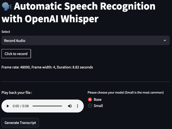 write_transcriptfunction writes the generated transcript to a text file, stored in theTRANSCRIPT_DIR. - User Interface: Streamlit is employed to create an intuitive user interface, allowing users to upload audio files, choose the ASR model, generate transcripts, and download the results. The interface also provides playback functionality for the uploaded audio file.